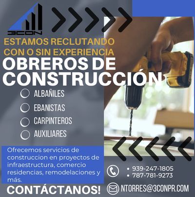 ¡Sé parte del cambio y ayúdanos a reconstruir Puerto Rico! En 3CON, estamos en la búsqueda de obreros de construcción con o sin experiencia para unirse a nuestro equipo. Si tienes habilidades en albañilería, carpintería, ebanistería o asistencia en construcción, esta es tu oportunidad de formar parte de proyectos clave en infraestructura, comercio, residencias y remodelaciones.Ofrecemos un ambiente de trabajo dinámico y equipo de calidad. !Contáctanos hoy mismo!